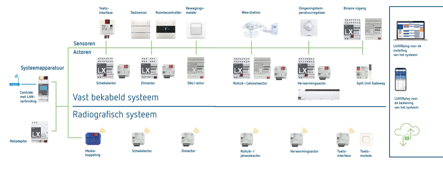 Systeemapparaten vormen het hart en de ruggengraat van elk LUXORliving KNX Smart Home systeem. De IP1 systeemcentrale wordt gebruikt om het LUXORliving Smart Home systeem via de LUXORplug Windows software in bedrijf te stellen. Het slaat ook de projectgegevens op voor visualisatie met de LUXORplay app. De LUXORliving P640 voeding levert en bewaakt betrouwbaar de systeemspanning. LUXORliving startsets bestaan uit een systeemcentrale, voeding, actoren, impulsdrukker-interfaces en weerstation. Ze maken een snelle start mogelijk voor het opzetten van een LUXORliving KNX Smart Home systeem.