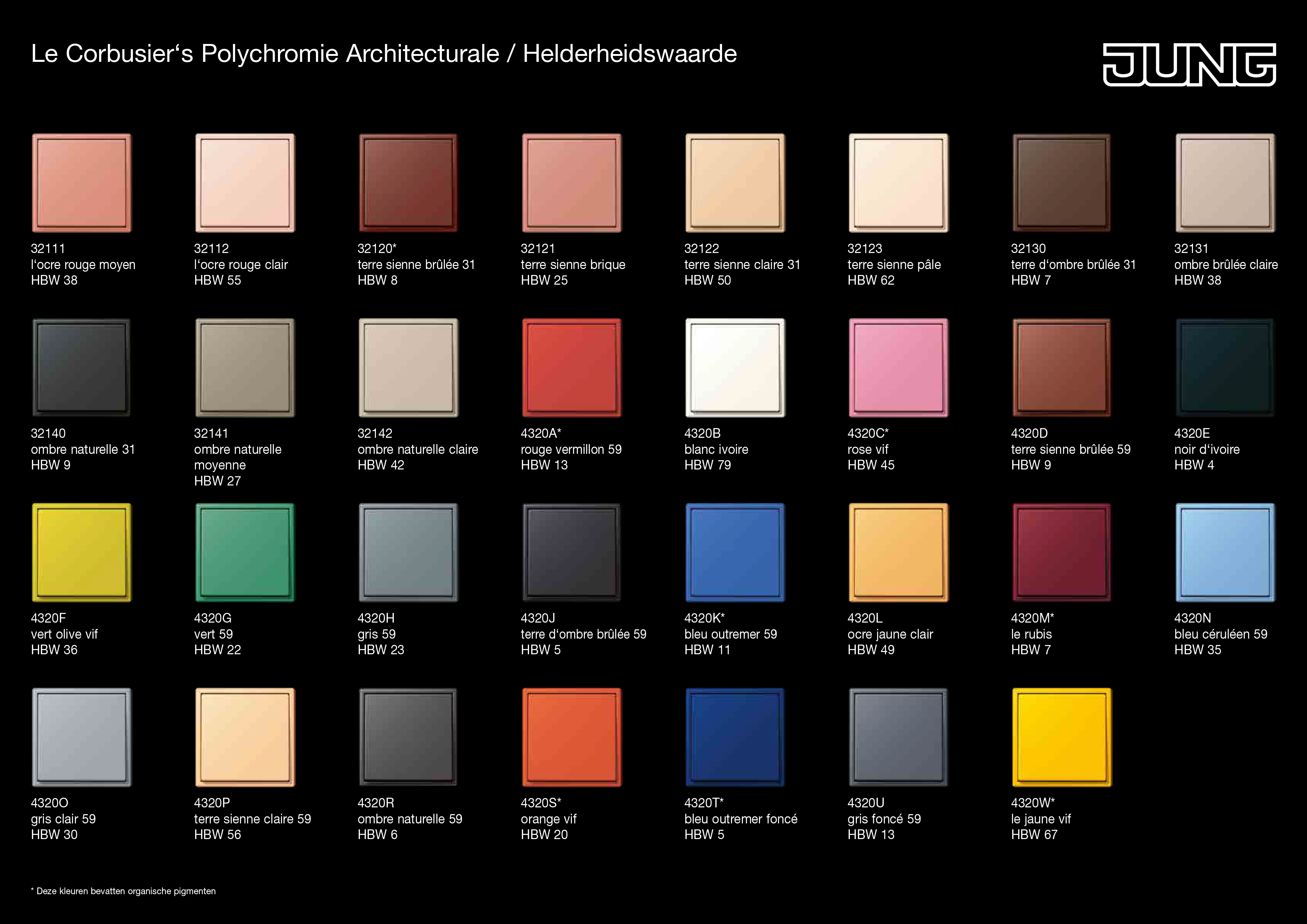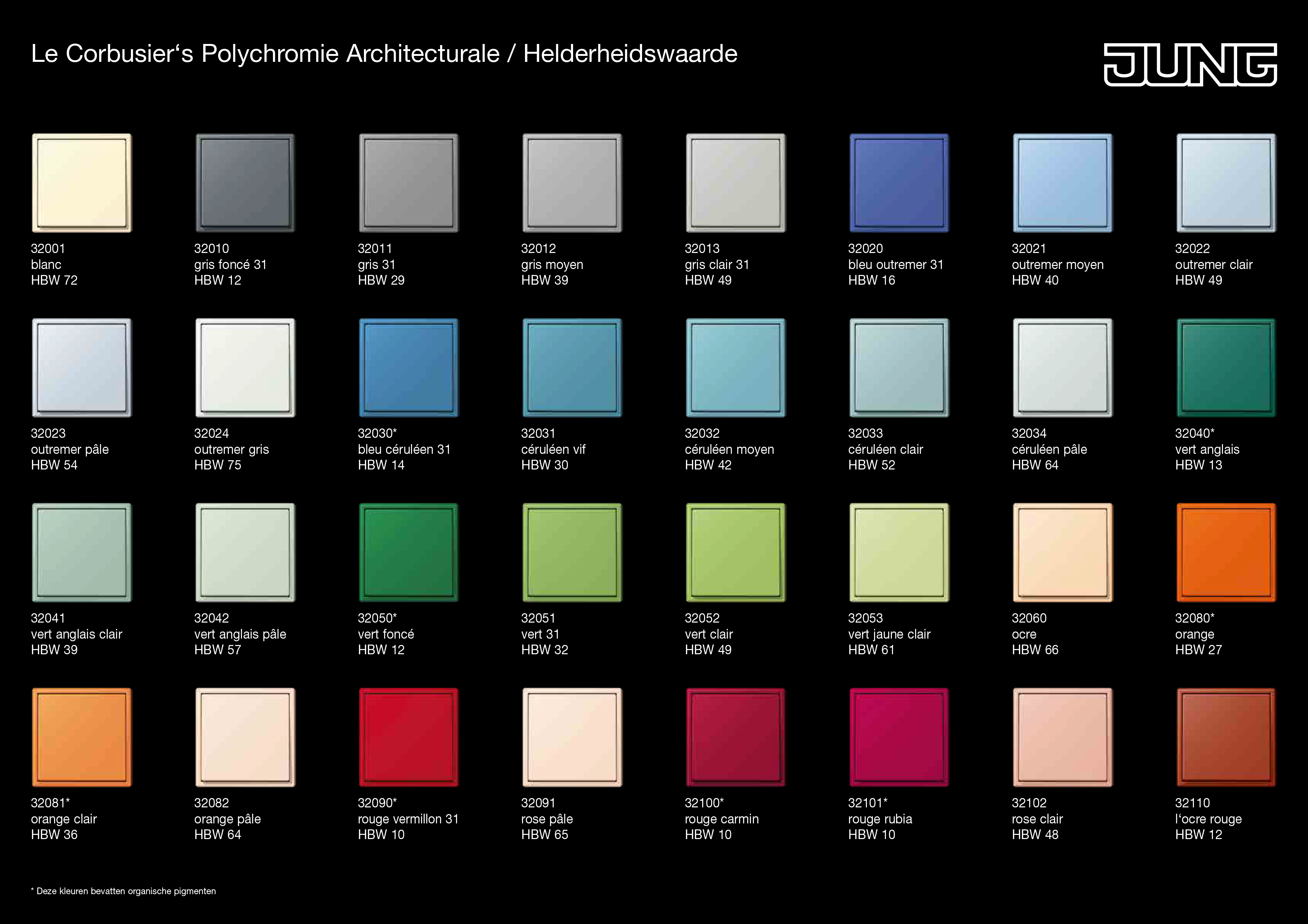 Wereldwijd exclusief biedt Jung het tijdloze programma LS 990 in de 63 originele Les Couleurs Le Corbusier aan. Le Corbusier geldt als één van de beroemdste architecten van de 20e eeuw. Het bijzondere aan zijn kleurensysteem: elke van de 63 kleuren is met elke andere uit het systeem te combineren. Op basis van deze opmerkelijke eigenschap en de unieke kleurdiepte inspireert het kleurenpalet vandaag nog steeds.